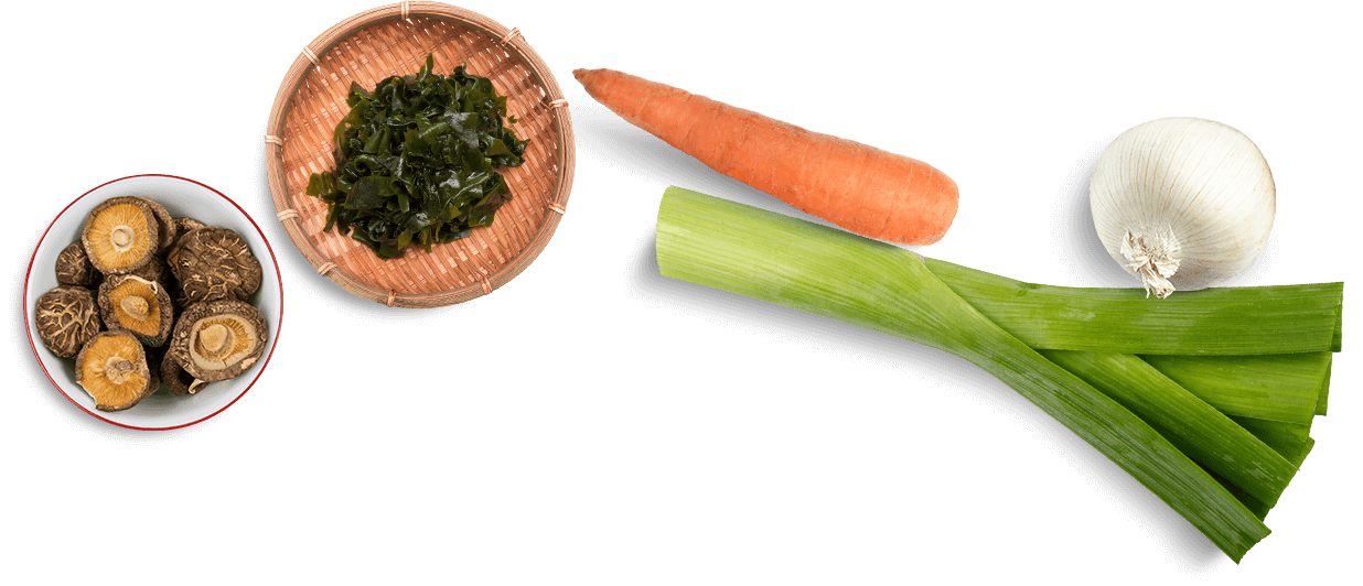 šálek čerstvé zeleninové směsi (houby shiitake, pórek, bílá cibule, mrkev, kousek řasy wakame). Případně přidejte do vývaru nudle soba.